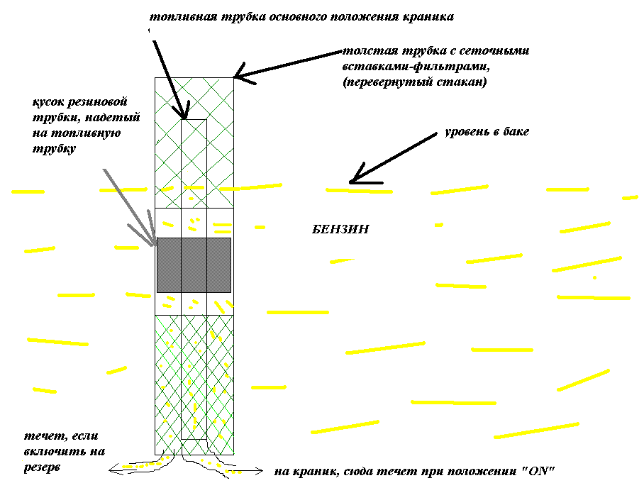 По кранику. трубка резерва - это забор снизу, воооот та внутренняя трубка, которая почти до верха наружной - это забор в основном положении, и бензин в нее течет само собой если уровень выше в баке этой трубки. Да, был, как вы выразились, сифон, бензин внутри наружной трубки поднимался вверх мимо плохой резинки до внутренней высокой трубки и попадал в рабочий основной канал крана. Почему он туда попадал, ведь трубка из сеточки по сути, пропустила бы воздух да и не возник бы "сифон". Цитата: