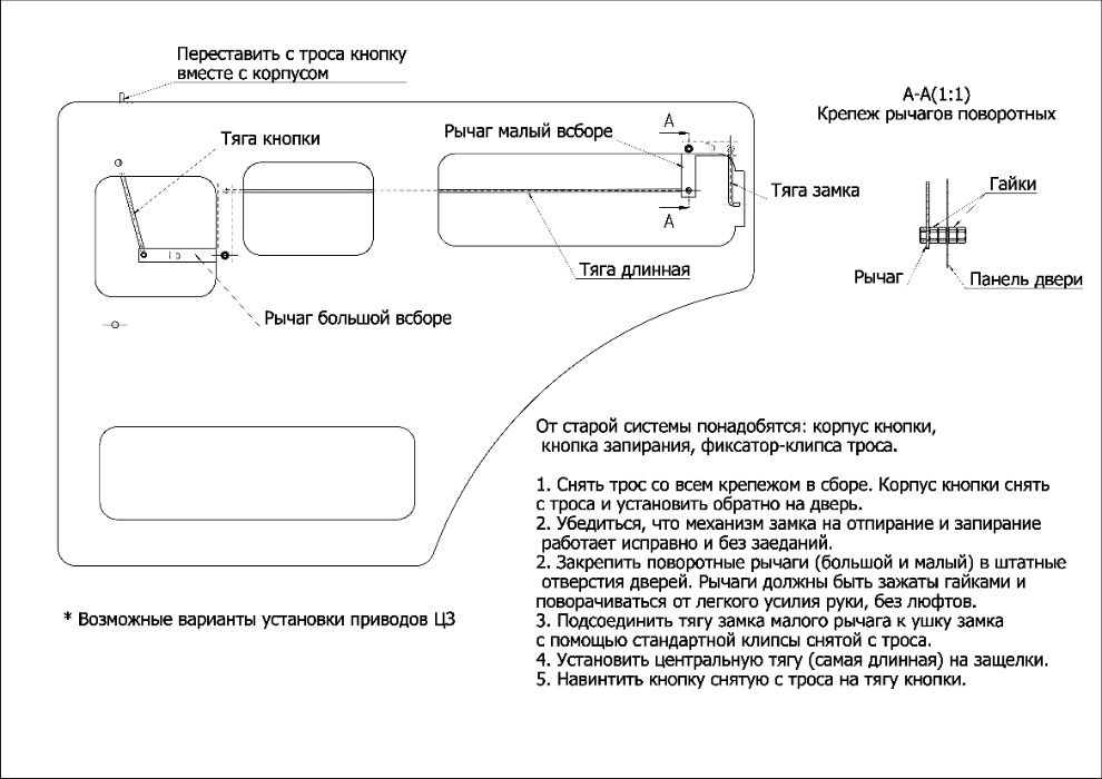 себе установил и переделкой очень доволен. Установка максимально простая: 1. Снять трос со всем крепежом в сборе. 2. Закрепить поворотные рычаги (болты М5) в штатные отверстия дверей. (Рычаги должны быть зажаты и вращаться от легкого усилия руки, без люфтов, во избежания дребезга на неровностях). 3. Установить тягу замка (самая короткая) крепится защелками. К замку крепится стандартной защелкой-клипсой которая держала трос возле замка (фото ниже). 4. Установить центральную тягу (самая длинная) на защелки (в комплекте). 5. Установить тягу кнопки. Докупать ничего не нужно. От старой системы понадобятся: держатель троса, кнопка запирания, защелка-клипса троса. Внутри - Фото необходимого: